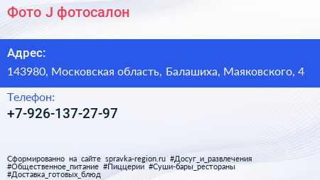 Фото-J, фотосалон по адресу 143980, Московская область, Балашиха, Маяковского, 4 в дальнейшем Организация, размещена в следующих категориях: