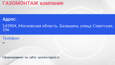 ГАЗОМОНТАЖ, компания по адресу 143904, Московская область, Балашиха, улица Советская, 19е в дальнейшем Организация, размещена в следующих категориях:
