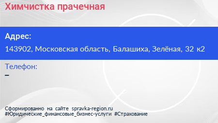 Химчистка-прачечная по адресу 143902, Московская область, Балашиха, Зелёная, 32 к2 в дальнейшем Организация, размещена в следующих категориях: