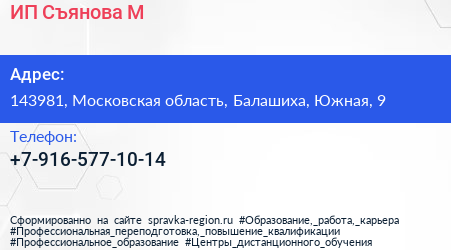 ИП Съянова М. по адресу 143981, Московская область, Балашиха, Южная, 9 в дальнейшем Организация, размещена в следующих категориях: