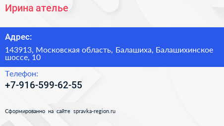 Ирина, ателье по адресу 143913, Московская область, Балашиха, Балашихинское шоссе, 10 в дальнейшем Организация, размещена в следующих категориях: