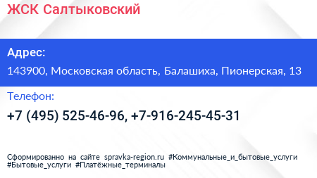 ЖСК Салтыковский по адресу 143900, Московская область, Балашиха, Пионерская, 13 в дальнейшем Организация, размещена в следующих категориях: