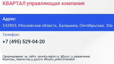 КВАРТАЛ, управляющая компания по адресу 143903, Московская область, Балашиха, Октябрьская, 10а в дальнейшем Организация, размещена в следующих категориях: