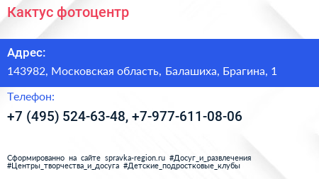 Кактус, фотоцентр по адресу 143982, Московская область, Балашиха, Брагина, 1 в дальнейшем Организация, размещена в следующих категориях: