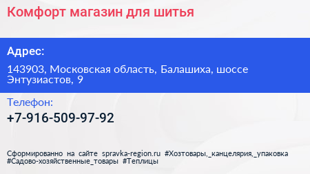 Комфорт, магазин для шитья по адресу 143903, Московская область, Балашиха, шоссе Энтузиастов, 9 в дальнейшем Организация, размещена в следующих категориях: