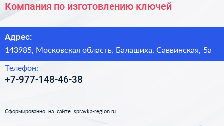Компания по изготовлению ключей по адресу 143985, Московская область, Балашиха, Саввинская, 5а в дальнейшем Организация, размещена в следующих категориях: