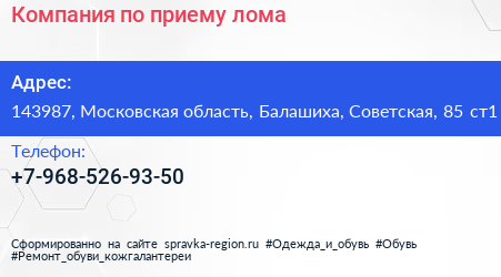 Компания по приему лома по адресу 143987, Московская область, Балашиха, Советская, 85 ст1 в дальнейшем Организация, размещена в следующих категориях: