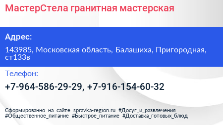 МастерСтела, гранитная мастерская по адресу 143985, Московская область, Балашиха, Пригородная, ст133в в дальнейшем Организация, размещена в следующих категориях: