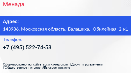 Менада по адресу 143986, Московская область, Балашиха, Юбилейная, 2 к1 в дальнейшем Организация, размещена в следующих категориях: