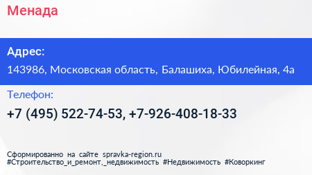 Менада по адресу 143986, Московская область, Балашиха, Юбилейная, 4а в дальнейшем Организация, размещена в следующих категориях: