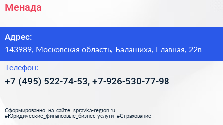 Менада по адресу 143989, Московская область, Балашиха, Главная, 22в в дальнейшем Организация, размещена в следующих категориях: