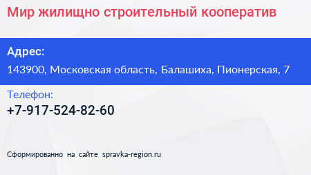 Мир, жилищно-строительный кооператив по адресу 143900, Московская область, Балашиха, Пионерская, 7 в дальнейшем Организация, размещена в следующих категориях: