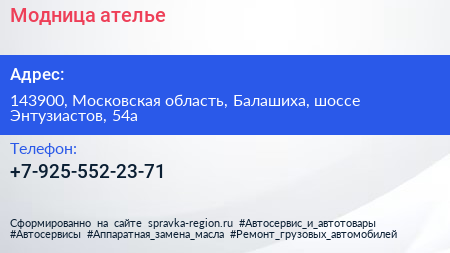 Модница, ателье по адресу 143900, Московская область, Балашиха, шоссе Энтузиастов, 54а в дальнейшем Организация, размещена в следующих категориях: