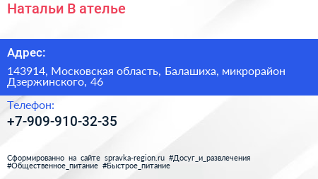 Натальи В, ателье по адресу 143914, Московская область, Балашиха, микрорайон Дзержинского, 46 в дальнейшем Организация, размещена в следующих категориях: