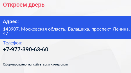 Откроем дверь по адресу 143907, Московская область, Балашиха, проспект Ленина, 47 в дальнейшем Организация, размещена в следующих категориях: