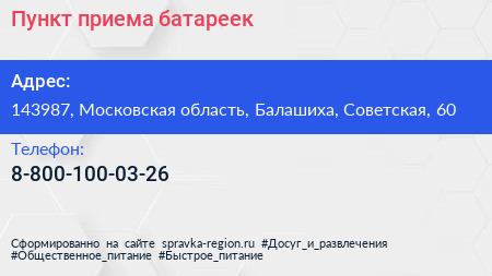 Пункт приема батареек по адресу 143987, Московская область, Балашиха, Советская, 60 в дальнейшем Организация, размещена в следующих категориях:
