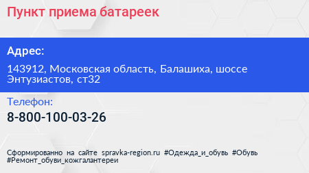 Пункт приема батареек по адресу 143912, Московская область, Балашиха, шоссе Энтузиастов, ст32 в дальнейшем Организация, размещена в следующих категориях: