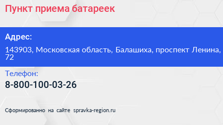 Пункт приема батареек по адресу 143903, Московская область, Балашиха, проспект Ленина, 72 в дальнейшем Организация, размещена в следующих категориях: