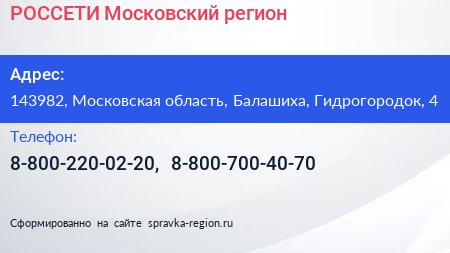 РОССЕТИ Московский регион по адресу 143982, Московская область, Балашиха, Гидрогородок, 4 в дальнейшем Организация, размещена в следующих категориях: