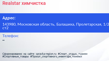 Realstar, химчистка по адресу 143980, Московская область, Балашиха, Пролетарская, 1/2 ст2 в дальнейшем Организация, размещена в следующих категориях: