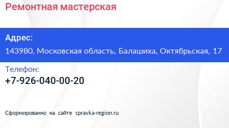 Ремонтная мастерская по адресу 143980, Московская область, Балашиха, Октябрьская, 17 в дальнейшем Организация, размещена в следующих категориях: