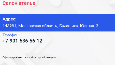 Салон-ателье по адресу 143981, Московская область, Балашиха, Южная, 3 в дальнейшем Организация, размещена в следующих категориях: