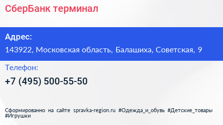 СберБанк, терминал по адресу 143922, Московская область, Балашиха, Советская, 9 в дальнейшем Организация, размещена в следующих категориях: