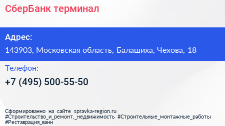 СберБанк, терминал по адресу 143903, Московская область, Балашиха, Чехова, 18 в дальнейшем Организация, размещена в следующих категориях: