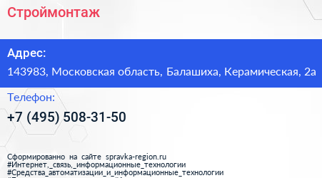 Строймонтаж по адресу 143983, Московская область, Балашиха, Керамическая, 2а в дальнейшем Организация, размещена в следующих категориях: