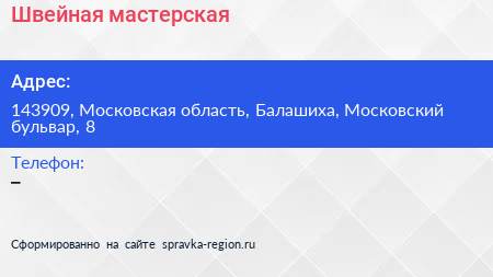 Швейная мастерская по адресу 143909, Московская область, Балашиха, Московский бульвар, 8 в дальнейшем Организация, размещена в следующих категориях: