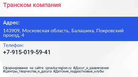Транском, компания по адресу 143909, Московская область, Балашиха, Покровский проезд, 4 в дальнейшем Организация, размещена в следующих категориях: