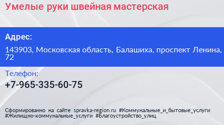 Умелые руки, швейная мастерская по адресу 143903, Московская область, Балашиха, проспект Ленина, 72 в дальнейшем Организация, размещена в следующих категориях: