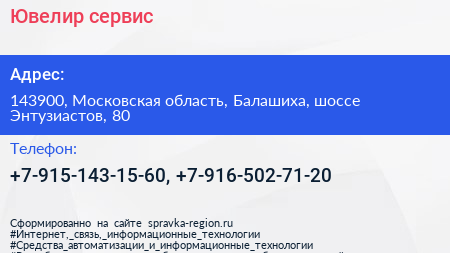 Ювелир-сервис по адресу 143900, Московская область, Балашиха, шоссе Энтузиастов, 80 в дальнейшем Организация, размещена в следующих категориях: