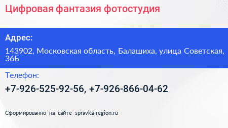 Цифровая фантазия, фотостудия по адресу 143902, Московская область, Балашиха, улица Советская, 36Б в дальнейшем Организация, размещена в следующих категориях: