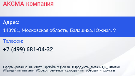 АКСМА, компания по адресу 143981, Московская область, Балашиха, Южная, 9 в дальнейшем Организация, размещена в следующих категориях:
