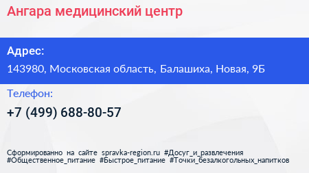 Ангара, медицинский центр по адресу 143980, Московская область, Балашиха, Новая, 9Б в дальнейшем Организация, размещена в следующих категориях: