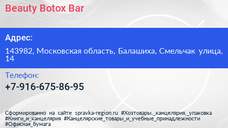 Beauty Botox Bar по адресу 143982, Московская область, Балашиха, Смельчак улица, 14 в дальнейшем Организация, размещена в следующих категориях: