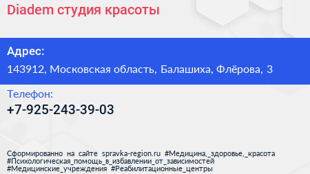 Diadem, студия красоты по адресу 143912, Московская область, Балашиха, Флёрова, 3 в дальнейшем Организация, размещена в следующих категориях: