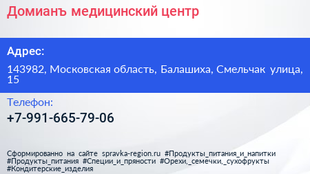 Домианъ, медицинский центр по адресу 143982, Московская область, Балашиха, Смельчак улица, 15 в дальнейшем Организация, размещена в следующих категориях: