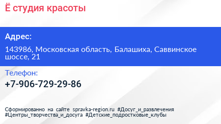 Ё, студия красоты по адресу 143986, Московская область, Балашиха, Саввинское шоссе, 21 в дальнейшем Организация, размещена в следующих категориях: