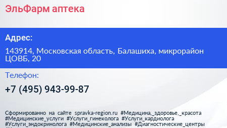 ЭльФарм, аптека по адресу 143914, Московская область, Балашиха, микрорайон ЦОВБ, 20 в дальнейшем Организация, размещена в следующих категориях: