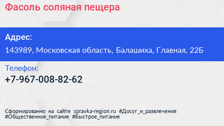 Фасоль, соляная пещера по адресу 143989, Московская область, Балашиха, Главная, 22Б в дальнейшем Организация, размещена в следующих категориях: