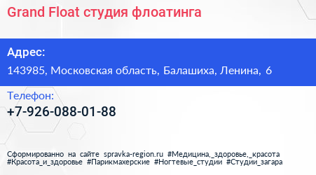 Grand Float, студия флоатинга по адресу 143985, Московская область, Балашиха, Ленина, 6 в дальнейшем Организация, размещена в следующих категориях: