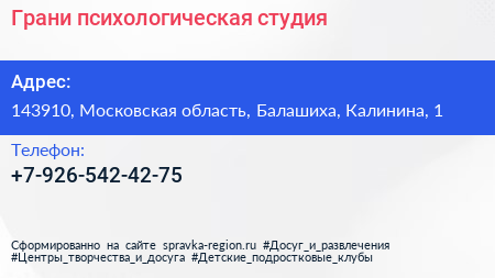 Грани, психологическая студия по адресу 143910, Московская область, Балашиха, Калинина, 1 в дальнейшем Организация, размещена в следующих категориях: