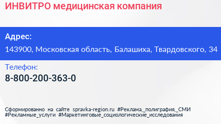 ИНВИТРО, медицинская компания по адресу 143900, Московская область, Балашиха, Твардовского, 34 в дальнейшем Организация, размещена в следующих категориях: