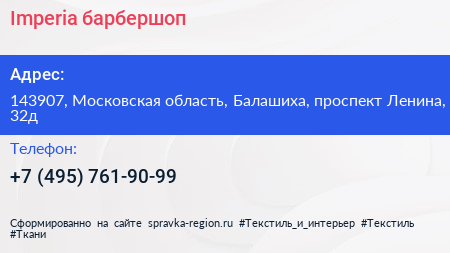 Imperia, барбершоп по адресу 143907, Московская область, Балашиха, проспект Ленина, 32д в дальнейшем Организация, размещена в следующих категориях: