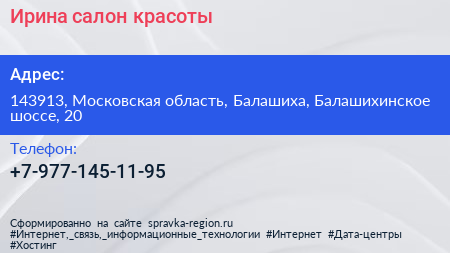Ирина, салон красоты по адресу 143913, Московская область, Балашиха, Балашихинское шоссе, 20 в дальнейшем Организация, размещена в следующих категориях: