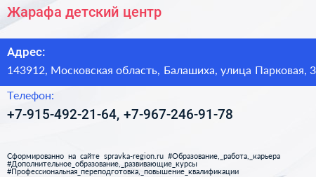 Жарафа, детский центр по адресу 143912, Московская область, Балашиха, улица Парковая, 3 в дальнейшем Организация, размещена в следующих категориях:
