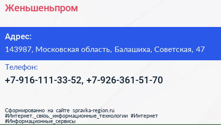 Женьшеньпром по адресу 143987, Московская область, Балашиха, Советская, 47 в дальнейшем Организация, размещена в следующих категориях: