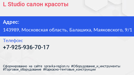L Studio, салон красоты по адресу 143989, Московская область, Балашиха, Маяковского, 9/1 в дальнейшем Организация, размещена в следующих категориях: